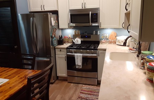 All sleeping is on the second floor, accessible by a normal staircase. The unit includes a washer and dryer, and a modern kitchen with refrigerator-freezer, gas stove, microwave, dishwasher, toaster and coffee maker, as well as all necessary plates, utensils and cookware. The kitchen table seats six. The cozy living room has a gas log fireplace, TV with streaming video service, and a view of the lake. The downstairs brick patio is shaded from the sun with ample comfortable seating for watching the boats, kids and ducks.