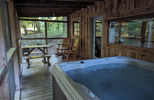 Soak in the Hot Tub on the screened in porch in a private setting that looks out over mature hardwood forest laden with ferns. Custom design with native hardwoods, concrete and stone. Handicap access.
