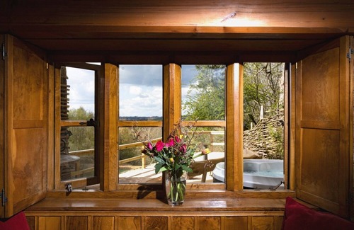 There's now a private terraced garden with sunken Hot Tub which has stunning views down to the pond and valley beyond. The garden is on two levels with wheelchair access to both levels. Beautifully handcrafted weaved hazel fencing with chestnut hardwood seating all from wood from the farm together with ornate brick floors gives a beautiful ambience to make you feel as if you're abroad! There's also a chiminea and adjustable lighting to warm you in the evenings.