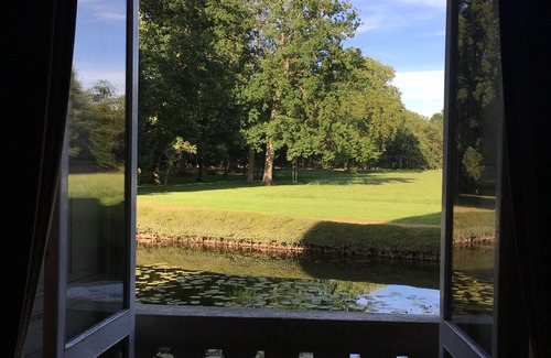 Very comfotably appointed and in excellent repair, sorrounded by broad moats and set in a magnificent landscaped park with lake, river and woods.