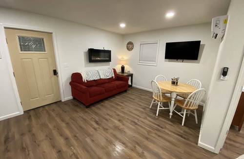 Small town country feeling. The suite has a small patio to sit and enjoy the outdoors, it has a fully stocked kitchen, full bathroom, one king size bed and a sofa bed. Smart TV and WiFi! Quiet cozy neighborhood.