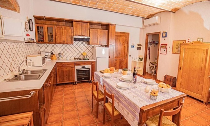 Portion of typical Maremma farmhouse surrounded by greenery and in an agricultural context just a few kilometres from the sea and the main beaches and attractions of the Costa d 'Argento. Large green space and patio equipped to live outdoors in total relaxationFurnished in a rustic style with typical Tuscan art furniture, the apartment is developed entirely on the ground floor. Entering the large kitchen equipped with a dining table, continuing we find the two bedrooms and a bathroom with a masonry shower. You can also access the outdoor patio from the double bedroom. Private parking on the property.