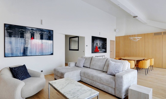 The living room is equipped with a flat-screen TV and the dining room offers an ideal space to relax, discuss or work. The kitchen, fully equipped, allows you to live the Parisian culinary experience according to your desires. A sofa bed is also available, we recommend a maximum occupancy of 4 adults and 2 children for greater comfort.