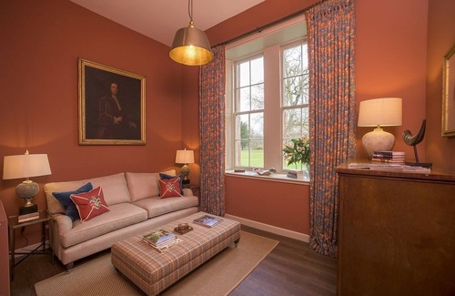 A warm and cosy feel is created in the sitting room with the deep coral walls and royal blue accents. As in the bedroom, a large portrait from the castle collection reflects the grandeur and history of the castle. Guests are made to feel part of the Thirlestane family with several personal photos in the hallway showing the Maitland family competing in the show-jumping and eventing competitions at several Olympics.