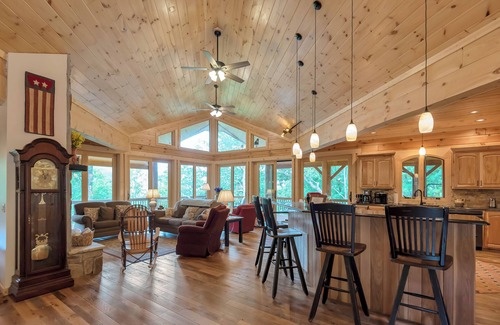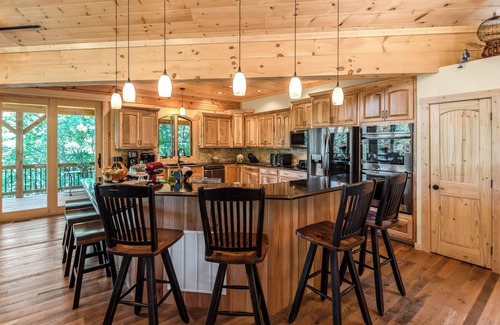 - Main level: Cathedral-style wood ceilings encompass a spacious open floor plan great room. Catch Blue Ridge views from the floor-to-ceiling windows in the living area while lounging around the gas-powered stone fireplace. You'll melt when you see the expansive kitchen, equipped with all of the tools and appliances you need.