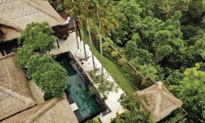 Set atop the limestone hills of Jimbaran, the villa impresses with three stand-alone pavilions framing an exotic garden courtyard where a private pool, a gazebo and a relaxing lounge area feature. With the dreamy white sands of Jimbaran Beach a mere five-minute walk away, this tropical villa has all the ingredients for the perfect family or group island hideaway. Each pavilion showcases a harmonious blend of distinctive Balinese charm with contemporary sensibilities, characterised by a traditional thatched roof and elegant comfort. The master bedroom on the top floor of the double storey pavilion boasts an expansive terrace with stunning views of cascading greenery down the hillside and the quaint garden courtyard below. The iconic Jimbaran seafood bay and Samasta Lifestyle Village are both a comfortable distance away on foot. Tucked away in a gated compound, the villa offers total privacy and security.