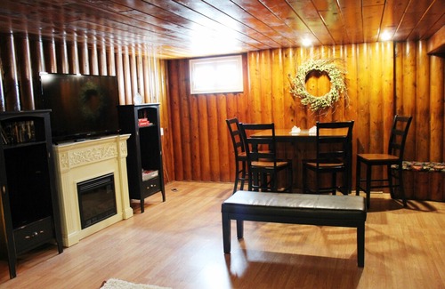 We have 2 living areas. The upstairs living room has plenty of space for gathering, and a sofa sleeper. The downstairs den has a Roku TV and DVD player, DVDs, board games, wrap-around seating and a couch.
