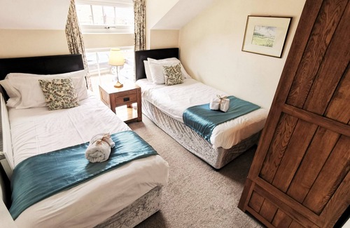 Upstairs the three bedrooms comprise a one double, and 2 twins, with wardrobes and chest of drawers. The bathroom includes an over bath power shower.