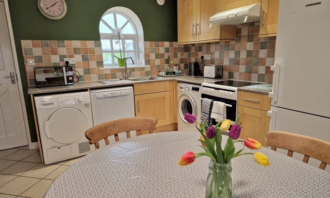 As you come in through the front door, you enter the spacious kitchen, which is fully equipped with cooker, microwave, fridge, freezer, dishwasher, microwave, washing machine and tumble dryer. The kitchen sink has a view over the garden, and the Vale beyond, and there is also a kitchen table with three chairs. There is also a dining area in the sitting room.