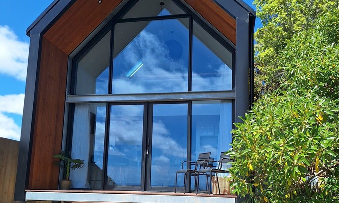 With the entire front of this 35m2 home encased in glass, the unique, stylish design incorporates a spacious mezzanine bedroom with ample room above the comfortable queen bed to walk around. A well equipped kitchen with a breakfast bar, sitting and dining areas, a bathroom with a glassed shower, combo washer/dryer and clever storage are incorporated into the main floor. The space is airy and light and the deck offers a lovely spot for coffee or evening cocktails. Listen to the birds in the native trees and look out for the quail and native fantails who nest nearby.