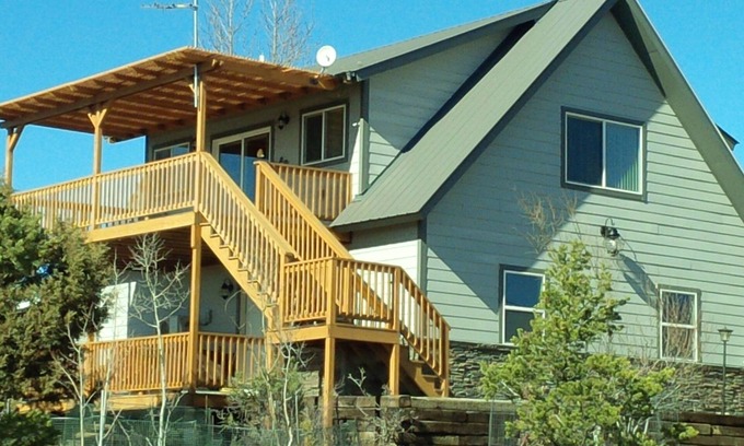 A Top the Carriage House is just a short 10 minute drive east of Durango. It's an up scale vacation rental with a 2nd story covered pergola that faces the beautiful La Plata Mountains with panoramic views of the surrounding area. Sit on the deck enjoy looking at the mountains, BBQ and eat outside in the cool evening air, you can relax and enjoy the amazing views. Come inside high speed internet is available for streaming Netflix, Hulu and Amazon video. King size bed in the master bedroom and queen bed up in the loft, along with the quality appliances in kitchen, there is a washer and dryer provided. Quite air conditioning will keep you cool on rare hot summer days and pellet stove helps heat when weather turns cold.