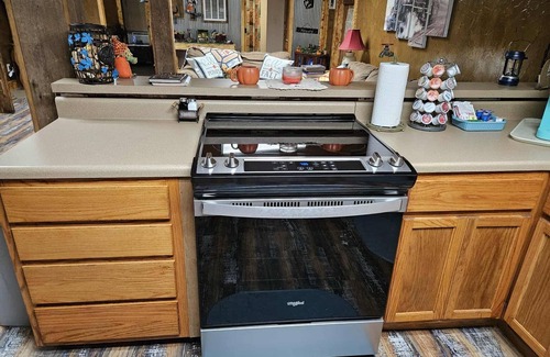A unique cabin made with old railroad ties from the railroad that came through Bengal, Ok, in the early 1890,s . A charming living area furnished with train memorabilla and antique peices through out the cabin.