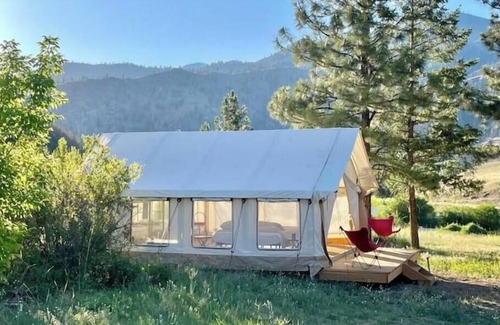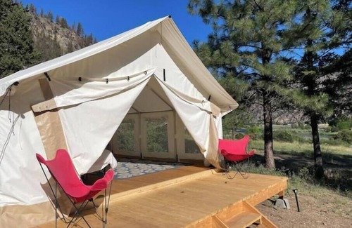 Reconnect with nature in style at Elderberry, our spacious 16x20 safari-style glamping tent, set on the wild and scenic Salmon River in Idaho. This cozy retreat comes equipped with comfortable beds, pillows, linens, a lockable storage trunk, a lantern, and two deck chairs—everything you need for a restful stay. Just bring your personal items and a sense of adventure! Whether you're seeking relaxation or adventure, our Elderberry is the perfect spot for your next family getaway!