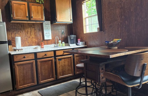 The kitchen has refrigerator/ freezer, single burner stove top, microwave oven, electric skillet, blender, coffee maker everything necessary for meal preparation and serving.