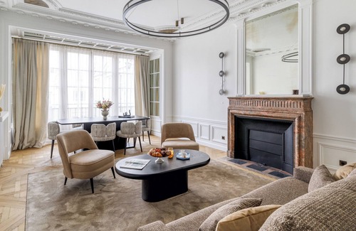 The Versailles parquet flooring, the ceiling mouldings and the high ceilings all reflect the old-world prestige of this typically Parisian flat.