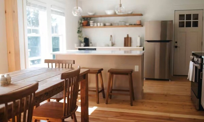 -Your KITCHEN and DINING ROOM is filled with natural light overlooking a slight view of Lake Hebron. This space includes a full-size refrigerator and freezer, microwave, oven, electric range, dishwasher, toaster, Keurig coffee maker and 6-seat dining table. If you prefer to cook your meals in, the fridge and freezer are both full size and are great for storing all your groceries. The coffee/tea station includes a Keuirg coffee maker, k-cups, tea, creamer, sugar and sweet n’low. You will find plates, bowls, drinking glasses, coffee mugs, wine glasses & wine opener, silverware, pots and pans and basic cooking needs such as salt & pepper, and a fully stocked spice rack. The dining table is perfect to enjoy your meals or perhaps, if you work remotely, it's a nice place to work!