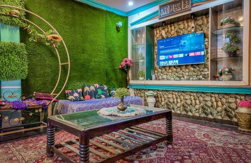 Our spacious living room is designed for relaxation and entertainment, equipped with a 55-inch 4K TV and a fun carrom board. Additionally, we provide a single bed and a king-size mattress for your sleeping arrangements.