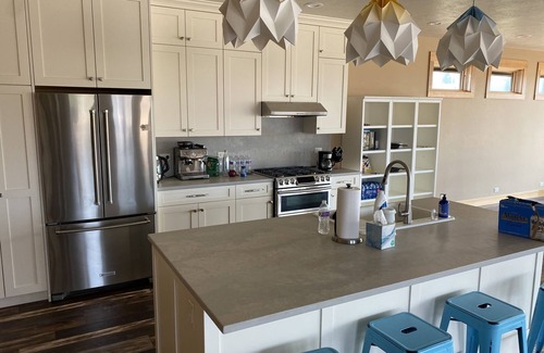 The Range View Cabin at ABC acres was built in 2019. Offering one dedicated bedroom, sofa bed, spacious and comfortable living space, and an open functional kitchen, Range View sits at over 1600 sqft. Built with 2x6 framing and non-toxic spray foam insulation, the structure boasts R-30 in the walls and over R-50 in the ceiling. The structure was built with no-VOC’s both inside and out, which speaks to the underlying theme of healthy environments that pervade the Farm estate. The space offers both forced heat and air conditioning for your comfort, via a mini-split system. Water supplied to the space originates from a well 90’ below the ground. To ensure a clean, healthy drinking / bathing experience, all water is routed through an iron filtration system then finally through an ‘Alive Water’ system to reinvigorate & re-energize the water at all points of use. On the exterior, a concrete seating area is situated on two sides for your viewing pleasure, while offering privacy from the farm entrance to the East.