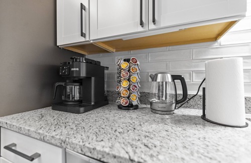 You’ll have everything you need to prepare a homemade feast—or just brew your morning coffee. Granite countertops, a full-sized fridge, stove, microwave, drip coffee maker, electric tea kettle, and a Keurig are all at your disposal. Enjoy a quick bite or a leisurely breakfast at the cozy eat-in nook for two.