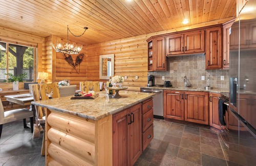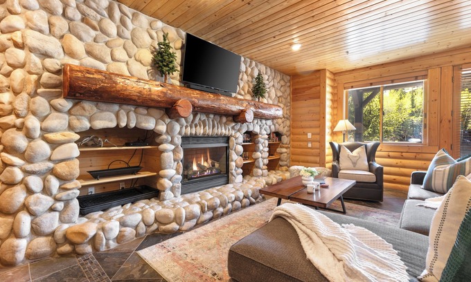 The open floor plan and high ceilings accentuate the mountain modern vibe and also create a light and airy shared space with the spacious kitchen, dining table, and cozy living room. The chef in your group will love the gourmet kitchen with all of its high end stainless steel appliances. Get cozy on one of the couches in front of the flat screen tv and toasty fireplace that extends all the way from the floor to the ceiling.