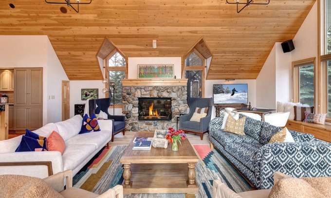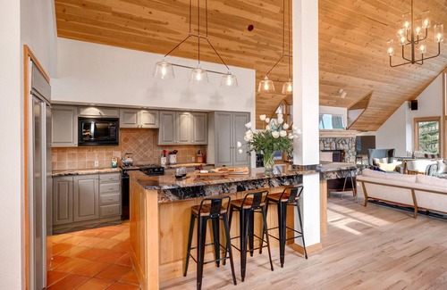 Soaring vaulted wood ceilings bring drama and warmth to an expansive open living space, while floor to ceiling windows showcase the towering pines and aspen. You'll find plenty of seating for everyone to spread out or to warm up in front of the beautiful river rock fireplace and enjoy each other's company. Rich marble countertops line a fully equipped kitchen where the cook will have everything they need to satisfy hearty appetites. A beautiful modern dining table can seat eight people with additional room for three at the counter. A grill is also available for a fun night barbecuing and relaxing on the spacious deck overlooking a lazy stream and the breathtaking mountain peaks beyond.