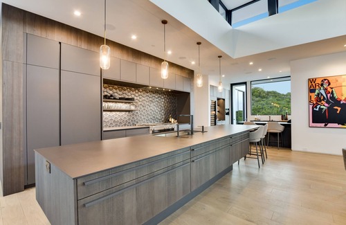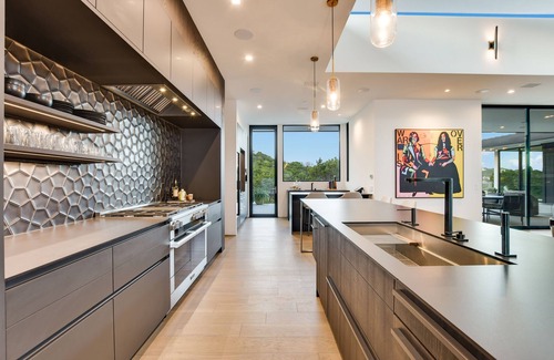 ABOVE ACCOLADE is a newly constructed, contemporary home in an exclusive Austin neighborhood will delight your group. Create memories in the award-winning kitchen and enjoy a private chef dinner with your group. Step onto the back patio to take in the stunning views while relaxing poolside. The back patio offers stunning views while relaxing poolside with your favorite beverage. As you enter the home, you are greeted with a spacious gathering area including the kitchen, living room, bar and beautiful views of the infinity edge pool and canyon. Our services team is available to help you create unique Austin experiences such as a boat day on nearby Lake Austin, a poolside margarita bar or relax with in-house massages in the Massage Room. This property is regularly set for 8 guests. Additional fees may apply. All guests must be pre-approved to rent this estate. A full guest list will be required. 3-night minimum May - October.