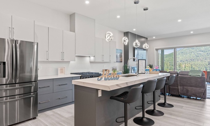 This beautiful 3-bedroom, 2-bathroom modern-style home offers the ideal blend of convenience and tranquility. Situated just a short 10-minute drive from town, you'll have easy access to shopping, groceries, golfing, water slides, beaches, and a plethora of water activities. But that's not all – in only 15 minutes, you can reach the renowned Silver Star Ski Resort for thrilling winter adventures. The home boasts breathtaking views and a private backyard oasis for your enjoyment. Whether you're relaxing indoors or exploring the nearby attractions, this home is your gateway to a life of comfort, convenience, and natural beauty. Garage is locked off for the owners. Guests do not have access to the garage.