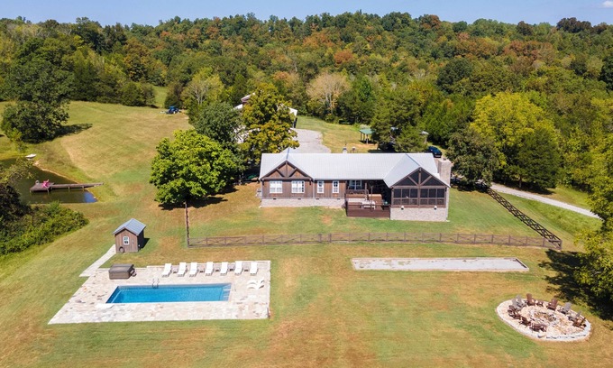 Welcome to the Rustic Retreat Farm by ABOVE Vacation Residences. Escape to your own private retreat with a weekend rental at this stunning 200-acre farm in Charlotte, Tennessee which is just 45 minutes outside of Nashville. This property features two charming residences to accommodate your group. The main house has three bedrooms and a bunk room. The large porch showcases breathtaking views of rolling hills and lush pastures. The secondary cabin provides a comfortable retreat with one bedroom and a loft that sleeps six. Your weekend will be filled with enjoyment in the expansive party barn, a versatile space designed for celebrations and gatherings. Unwind in your private pool, surrounded by a deck and hot tub where you can soak up the sun. For a bit of friendly competition, challenge your guests to a game of bocce ball on your very own court. The property invites exploration with its well-maintained trails and scenic woodlands. Enjoy leisurely fishing in the pond, or take advantage of the access to Johnson Creek, which flows into the Cumberland River, offering additional outdoor adventures. Whether you’re planning a peaceful retreat, a fun-filled family weekend, or a memorable celebration, this Charlotte farm provides the ideal setting. Book your weekend escape today and experience the perfect blend of relaxation and recreation in this extraordinary estate.