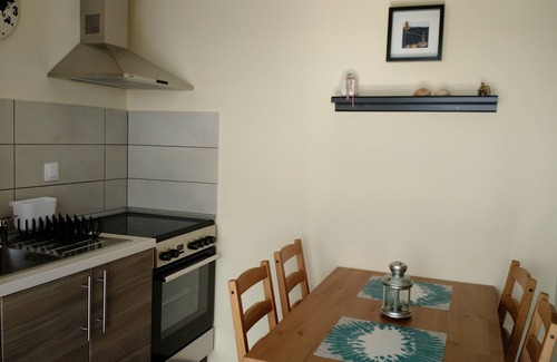 The modern fitted kitchen has all the necessary equipment for you to cook for four people, a fridge with freezer and a coffee maker. There is a dining table with 4 chairs and a LED HD TV. The air condition unit is there for you to adjust the room temperature at your desire.
