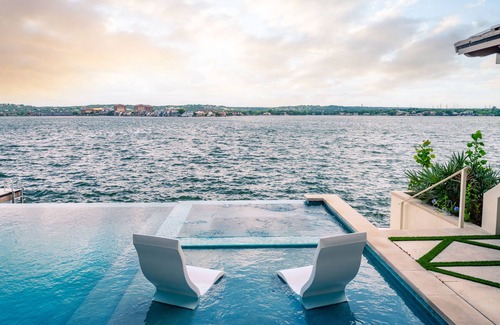 Welcome to the Above Vista del Faro Estate on Lake LBJ by ABOVE Vacation Residences in Horseshoe Bay- just a short drive from Austin. This stunning custom home features the wide open views through floor to ceiling glass windows/doors so that you are always looking at this amazing view. The gourmet kitchen and catering kitchen are fully stocked. With dining tables and lounge areas in the main living area and just steps away on the covered patio, your group can gather and relax both inside and outside. Watch the game on the patio from the pool or in the upstairs media room. This property is regularly set for 14 guests. Additional fees may apply. All guests must be pre-approved to rent this estate. A full guest list will be required. 3 night minimum.