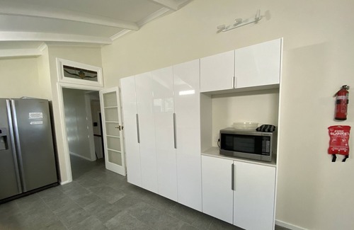 Kitchen has large 2 door fridge freezer, microwave, oven, grill, coffee machine, blender, toaster, electric fry pan and gas cooktop with 5 elements and 900mm electric oven.