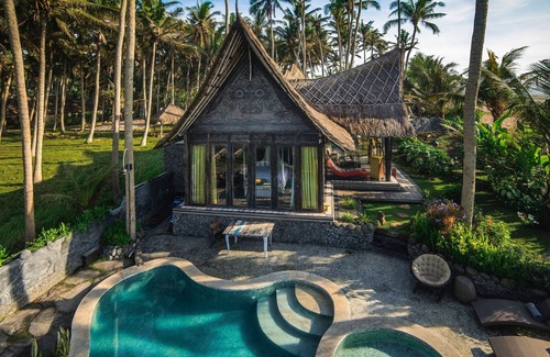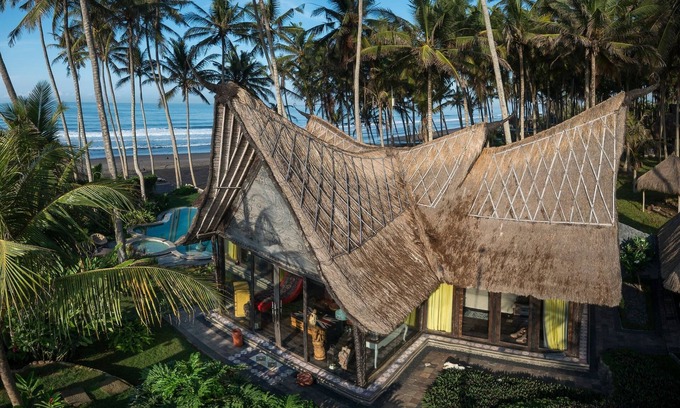 Fabulous villa situated by the ocean in a small palm grove. The atmosphere of this place is extremely romantic - secluded beaches, shimmering black sands, emerald rice terraces under the starry sky. Built from ironwood with huge panoramic windows to the floor that open up stunning views. Architecture bungalow - eclectic game Sumatran houses Menang Kabo and colonial charm, with their amazing roof, open upward like the wings of a magic bird and colonial charm.