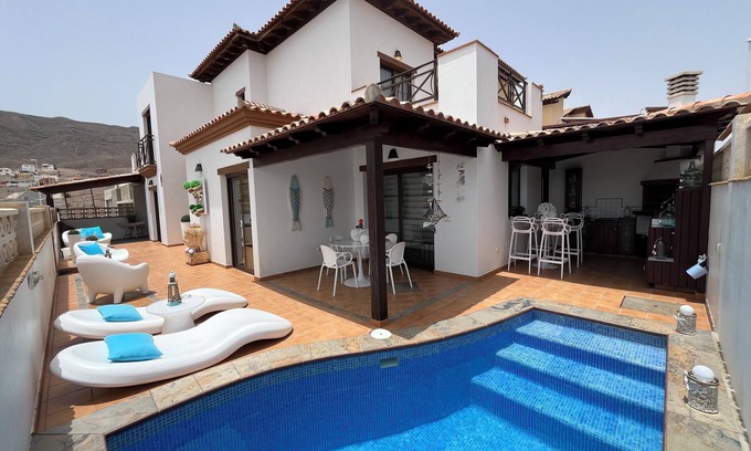 Best-rates for the Gran Tarajal house starts from $153 per night with includes Accessibility, Sports/Activities, Bedding/Linens, Wellness Facilities, Entertainment, Child Friendly, Ocean View, Oceanfront, Barbecue/Outdoor Cooking, Internet, Air Conditioner, Pool, TV, View, Fireplace/Heating, Hot Tub, Kitchen, Private Pool, Balcony/Terrace, Security/Safety, Guest Services, Laundry, Parking with all other amenities. Perfect for Weddings is committed to ensuring every guest experiences a comfortable and extraordinary stay, whether planning a romantic getaway, a honeymoon, a pet-friendly stay, or celebrating with the entire wedding party.