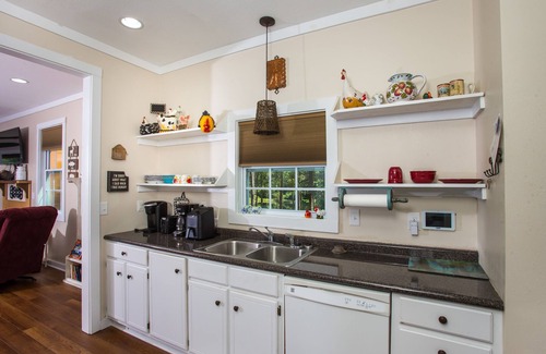 Full kitchen, living area with a beautiful real wood burning fireplace, and very spacious comfortable bedroom make for a very comfortable, cozy stay.