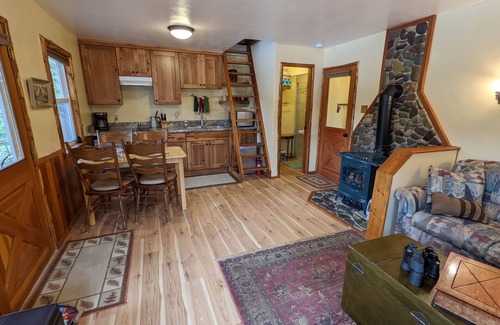 Back at Aspen Shores Cabin the pace can slow, allowing all your cares to melt away. The peaceful waters of Spoon Lake are a perfect setting with no motorboats or jet skis to disturb the wildlife. We focus on the outdoor experience and our cozy cabin provides the opportunity to come close together as family and friends. You can cook in the easy access kitchen while you watch the activities on the lake. Barbecue on the gas grill or warm yourself and play games in front of the elegant Waterford gas stove after a fine day of hiking, shopping or exploring. Climb the stairs/ladder to the cozy bedroom complete with king bed and two twin beds, or open the queen sleeper sofa in the living room and sleep right in front of the glowing fire. On warm days let the breeze blow through and smell the mountain air, or use the upstairs air conditioner for sleeping comfort.