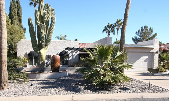 Ask about steep summer discounts. Absolutely southwest. Professionally furnished and fixtured like no other. Beautiful tropical themed totally private yard, Private swimming pool and exceptional spa. High quality king beds plus a queen Murphy bed.. Kitchen is fixtured with everything you could possibly need. Price is based on double occupancy. 55" smart TV ( LR ) 48" (MBR). Great quiet Sun Lakes location. 4 golf courses and clubhouses in the community.