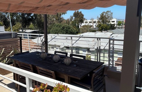 New, airy and light- filled three bedroom 2.5 bathroom townhouse in one of Santa Monica’s most charming and safest neighborhoods, Sunset Park. A duplex townhouse with only one shared wall, and tons of private outdoor space makes it feel like a single-family home yet in the heart of all the cute boutiques, restaurants, and shops on Ocean Park, and a stones throw from Clover Park, known to be one of Santa Monica’s best parks. It’s also a straight 5 minutes to easy access tower 26 beach. Indoor:outdoor living with our 1200 square-foot roof deck which includes a ping-pong table and outdoor dining and living room areas. Indoor Living areas are surrounded by patios and light and feels like Treehouse with wide open vistas in every direction. Bedding and linens are top-of-the-line and kitchen is more than fully equipped for people who love to cook. There is a barbecue on the patio just outside the kitchen and a small patio downstairs adjacent to the office/3rd bedroom with weights. Central A/C and a gas fireplace for chilly evenings. Plenty of games, books and toys for kids. Home is light and bright and beachy for indoor-outdoor SoCal living at its best.