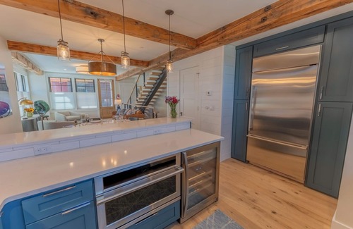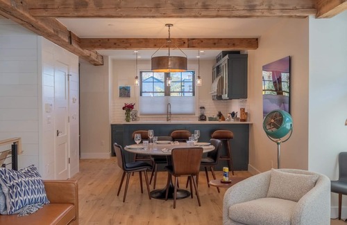 Step into the main level, where you’ll find a fully equipped kitchen featuring high-end appliances such as a Vitamix blender, Breville Barista Express, Cuisinart waffle maker, multi-cooker, and toaster. Whether you're preparing a quick breakfast or a gourmet meal, the kitchen is stocked with premium cookware, bakeware, and utensils to meet all your needs. The open-concept living area is the ideal space to unwind, with comfortable seating, mountain-inspired decor, and smart entertainment options for a cozy evening in.