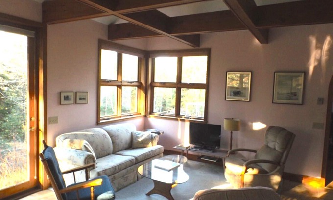 A wonderful spot for a restful, quiet getaway. Expansive windows in this clean, recently-built 2-bedroom home offer near and distant views peeping through the lovely mixed pine, fir and maple woods that offer peace and privacy. Relax into the comfy furniture on the lawn - choose sun or shade. Pick handfuls of native wild blueberries from your own blueberry field!