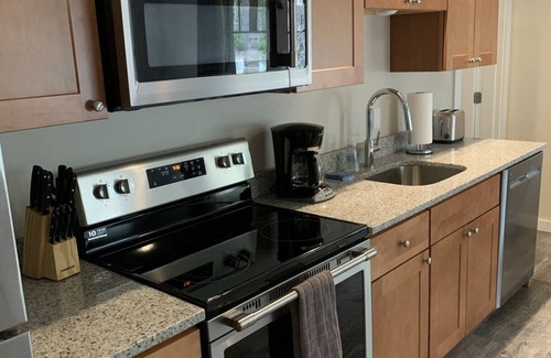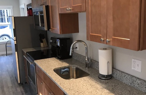 Newly built first floor studio apartment in Southwest Harbor. Modern hotel suite feel with a full kitchen and outdoor seating. Conveniently located to downtown, Acadia National Park, the Causeway Club, public seasonal bus & grocery store. All amenities are only minutes away! Located on a quiet, dead-end street, enjoy this peaceful vacation rental for your home-away-from-home. Newer construction inside & out, fully furnished & fully equipped for your enjoyment. Perfect for a couple and a small child. 1st floor studio apartment. 1 Queen + 1 Queen Sleeper Sofa. (See Related Rental Property #7636620.)