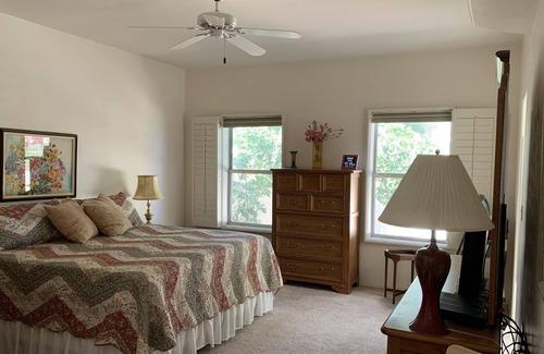 Beautiful townhome on the 18th hole of the Country Club of Green Valley (AZ). This home is 1615 sq. ft. with 2 br/2 ba, an office and 2-car garage. All amenities are here - full kitchen with electric range/oven, microwave, refrigerator, dishwasher, garbage disposal, and breakfast nook overlooking the front patio. The large dining room-living room (great room) has tall ceilings, lots of windows, dining table with leaf, leather couch, TV, DVD player, and a sliding door that exits to the rear patio which faces the 18th hole. The master bedroom is large. It has a king size bed with memory foam topper, walk-in closet, 3 dressers, 2 night stands, TV, and en-suite bathroom. The bathroom has two sinks, walk-in shower, and toilet room. The guest room has a queen bed, dresser, 2 night stands, and closet. Right next to the guest room is the guest bathroom with tub and shower. The laundry area with full size washer and dryer is across from the guest bathroom. The office is between the master bedroom and guest bathroom. It has a desk, credenzas, 2 leather chairs with footstools, built in well stocked bookshelves, and an opening to the great room. It's the perfect place to read, catch up on computer work, or have a quiet nap in the comfortable chairs. Each patio (front and back) has a table and 4 chairs. The back patio is partially covered and has rocking chairs and tables - the perfect spot for an afternoon snack. A grapefruit tree will help keep your breakfasts healthy. There is a grill on the back patio. A flagstone path runs along the side of the house connecting the front and rear patio. There are two rosebushes on that side, visible from the kitchen and dining area. The two-car garage has plenty of storage for you to keep things, and plenty of supplied items that may come in handy during your stay, including a cooler for picnics in Madera Canyon or the Historic Canoa Ranch.