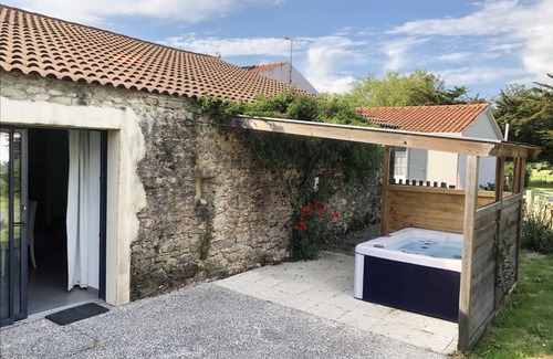 Gîte converted in 2013 in an old renovated barn, located in the heart of the Marais Breton, adjoining 2 other gîtes. Ground floor: living room/lounge/kitchen, 2 bedrooms (1 bed 160) (2 beds 90), shower room/wc accessible to disabled people. Covered multi-jet spa (included from May to September and 100€/week outside). Wifi. Private enclosed landscaped grounds of 150 m² with terrace (garden furniture, barbecue, 2 deckchairs). Shared: heated swimming pool (3.6x9.6m) open from May to September. The gîtes La Bourrine and La Pibole can be rented together. 4 other gîtes on site. Fishing pontoon on site accessible to disabled people. Options: End of stay cleaning: 70€/stay; Rental of sheets for 1 person: 10€/bed/stay; sheets for 2 people. 15€/bed/stay; Towel rental: 8€/pers./stay.