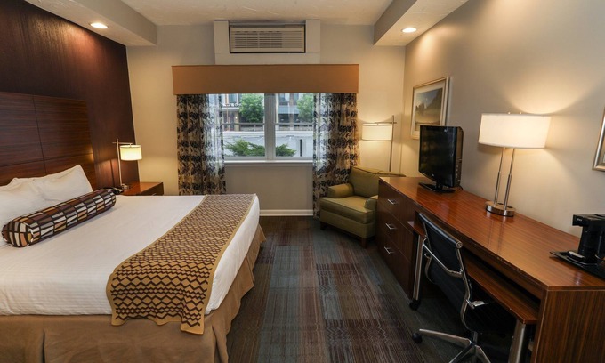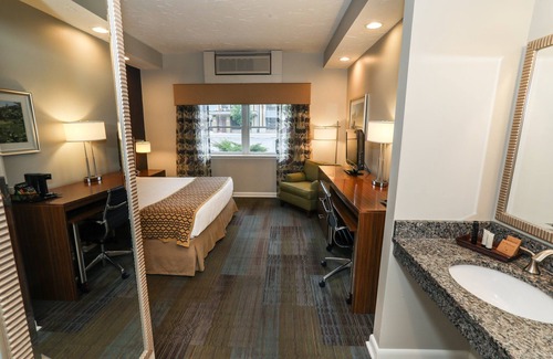 Experience convenience and comfort in the Alpine | King (Accessible) Room, designed for easy first-floor access. This thoughtfully appointed space features a plush king bed, free Wi-Fi, and in-room entertainment. With a handicap-accessible layout and an option for an extra cot, this non-smoking retreat ensures a relaxing stay, whether you're here for skiing, golfing, or a peaceful mountain escape.