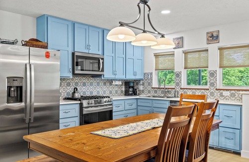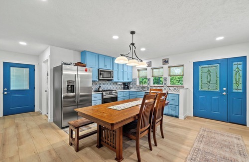 Inside, the living room is full of natural light and features cozy seating, a smart TV, and an electric fireplace. The open-concept kitchen is stocked with stainless steel appliances, cookware, a coffee maker, and toaster—everything you need for casual meals or big family dinners. Gather around the dining table with seating for 10 and make memories over food, games, or morning coffee.