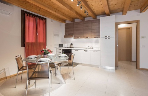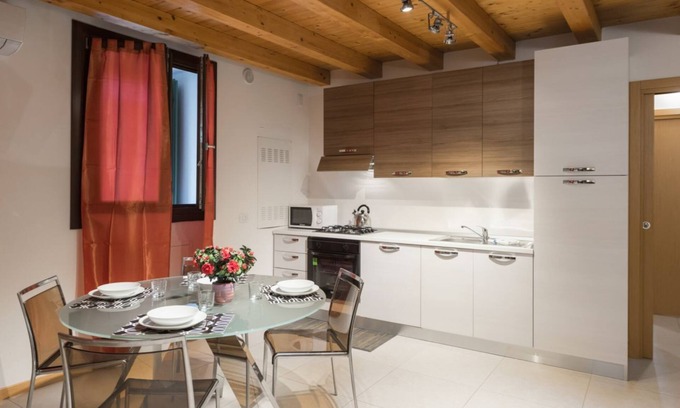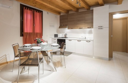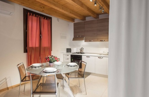 This elegant residence, located on the ground floor of a lovely recently renovated building, is located in the characteristic San Zeno neighborhood. The entire apartment, although furnished in a modern style, is characterized by a ceiling with exposed beams which gives the house a sense of warmth. The independent entrance opens directly onto the large living room furnished with a comfortable double sofa bed, TV, an elegant glass table with 4 chairs, and the kitchenette equipped with everything needed for cooking.