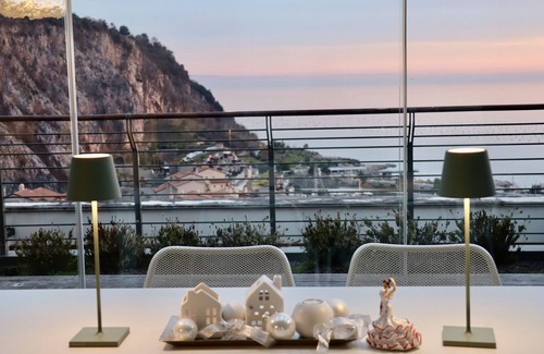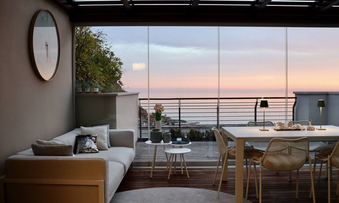 The closed terrace, wrapped in sliding glass panels, transforms into a welcoming summer living room, while the side veranda, accessible from the bedrooms, offers an intimate and rejuvenating space. Here, the colors of the sea and sky blend harmoniously with refined furnishings, creating an atmosphere of pure relaxation and tranquility.