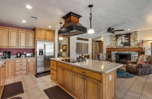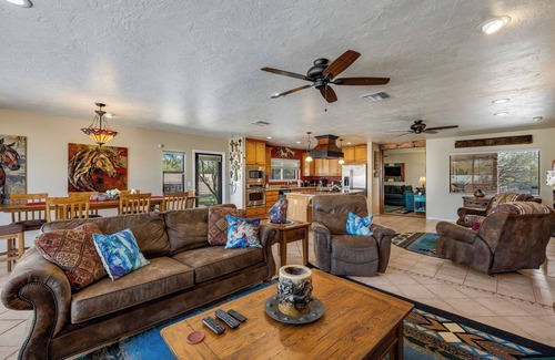 We are equine enthusiasts and our home reflects our love of horses. This spacious open floor plan has been comfortably furnished (everything in the house new in Jan-Feb 2015 and some things even newer) for family enjoyment or small group gatherings. Please, this is not a party house and not a neighborhood for large wedding receptions or graduation parties. We welcome small intimate gatherings where our guests appreciate the quiet serenity of this area. The master bedroom features a King bed and private patio, bdrm 2 has been remodeled to create a second master with direct access via pocket door to hall bath and a quiet, private patio overlooking the back yard and fire pit area. It features a Queen bed and twin size Lazy Boy sleeper sofa with temperpedic mattress. Bedroom 3 features two memory foam twin beds. There is a full size sofa/sleeper and a twin sleeper/sofa ( both temperpedic mattresses) in the den/4th bedroom with private 3rd full bath and its own patio overlooking the pool. It's great for a kids play area with its own TV, games and access to back yard. This multipurpose room can be closed off from the rest of the house with massive custom barn doors creating sound barrier and complete privacy.