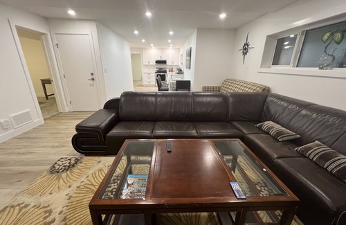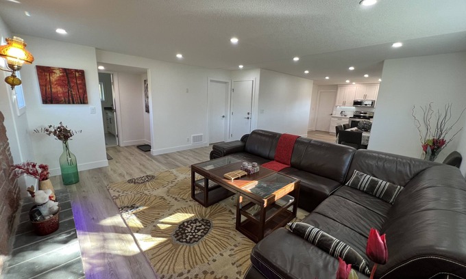Enjoy the 2 bedroom suite with luxurious airy 1200 sqft space, ideal for families or business travelers. Brand new kitchen, bedrooms, large living room with sectional leather sofa, 65” smart TV & colored LEDs throughout, work desk with Curved monitor, king size bed in Master bedroom with ensuite bath room, hotel linens; super soft carpet opulent décor. Close to all amenities in desirable Red Deer, recreation center near by. Easy access to arterial roads and to the Westerner Park/Centrium, Canyon Ski Hill.