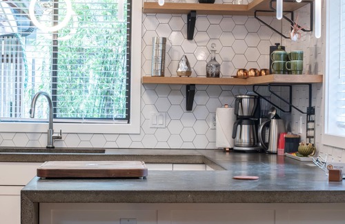 If it is raining outside, get cozy with the propane fireplace and throw blankets. Make yourself some tea and snacks in the beautiful large kitchen, and clean up is a breeze with the dishwasher. The kitchen is a foodie's dream. With high end appliances, lots of counter space, expansive cupboards and a concrete countertop with built in drain board next to our industrial sink, you will feel like a master chef.