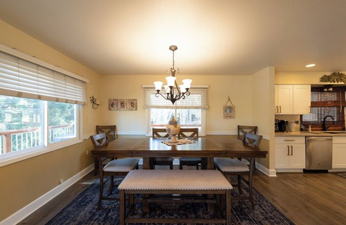 This fully renovated cabin is packed with amazing amenities designed to cater to your every need. Relax in the warm Jacuzzi after a long day of wedding preparations or enjoy some friendly competition in the game room complete with a pool table, Pacman, air hockey, and foosball. With four bedrooms and three bathrooms, there is ample room for everyone to unwind. Additionally, the fully stocked kitchen and large dining area will make hosting post-wedding brunches a delight. The fenced yard provides a private outdoor space for your guests to enjoy while they celebrate your love story.